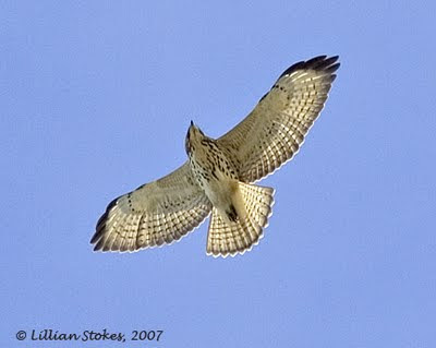 Yeah, I got the first impression that it might be a juvenile RTH too but the 4 fingers on the wing tips made me think again. And Eastern Red-tailed Hawks can be very light colored but this one, if it was a RTH would have to be very leucistic, almost an albino. That's when I pulled out my copy of Ligouri's book. The bird in the photo 1st cited is unmarked, much like this bird and show 4 fingers on it's wing tips. Red-tails have 5 prominent fingers on their wing tips.